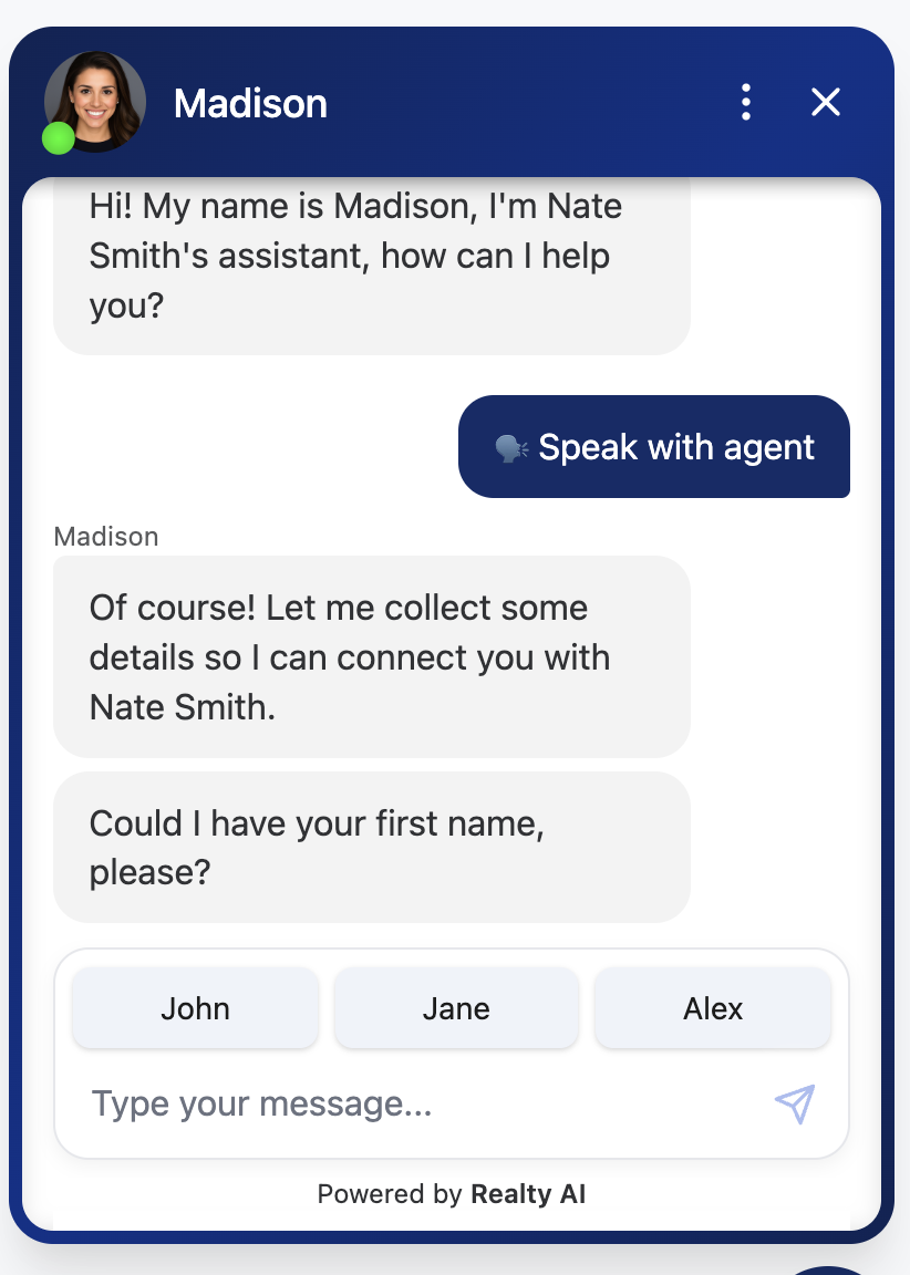 Our real estate chatbot built for agents, teams, and brokerages, set up to start conversations with your website visitors, capture their details through chat, and book them directly into your calendar.