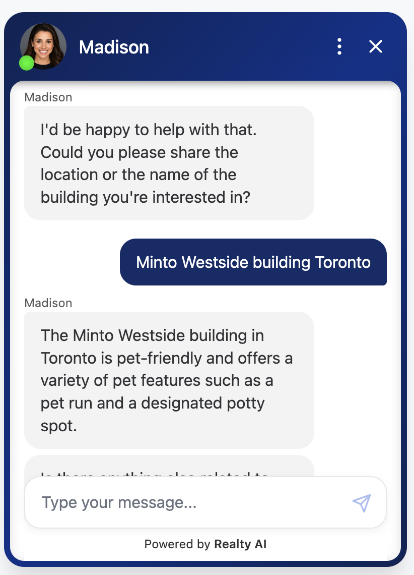 A chatbot is a live conversation window that starts talking to visitors the moment they land on your site. It asks them what they're looking for, answers their questions in real time, collects their contact details through the chat, and can book them a call or showing, all without anyone on your team doing anything.