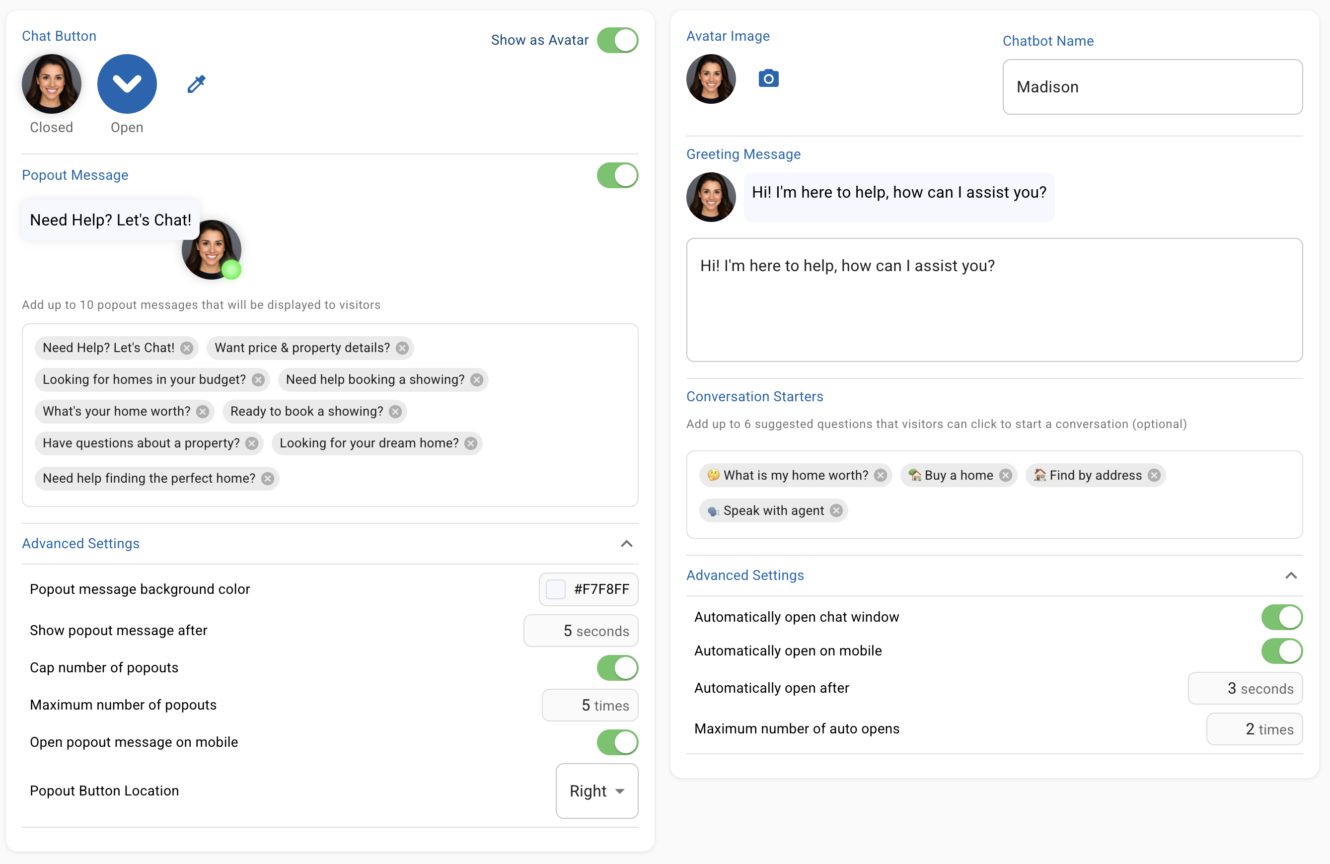 This is where Madison stops looking like a third-party widget and starts looking like part of your team. For a brokerage, these settings matter more than they do for a solo agent: the chatbot is the first impression for every visitor across every page of your site.